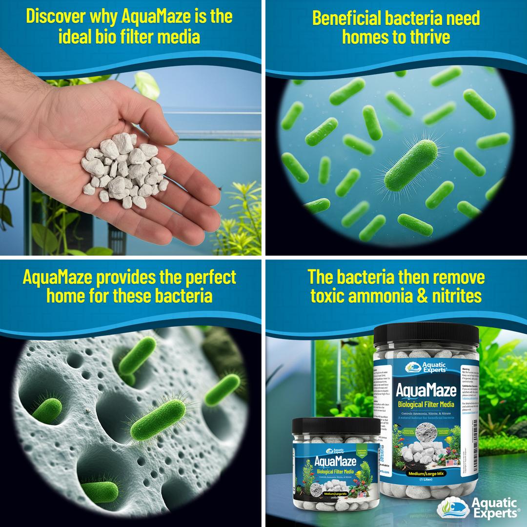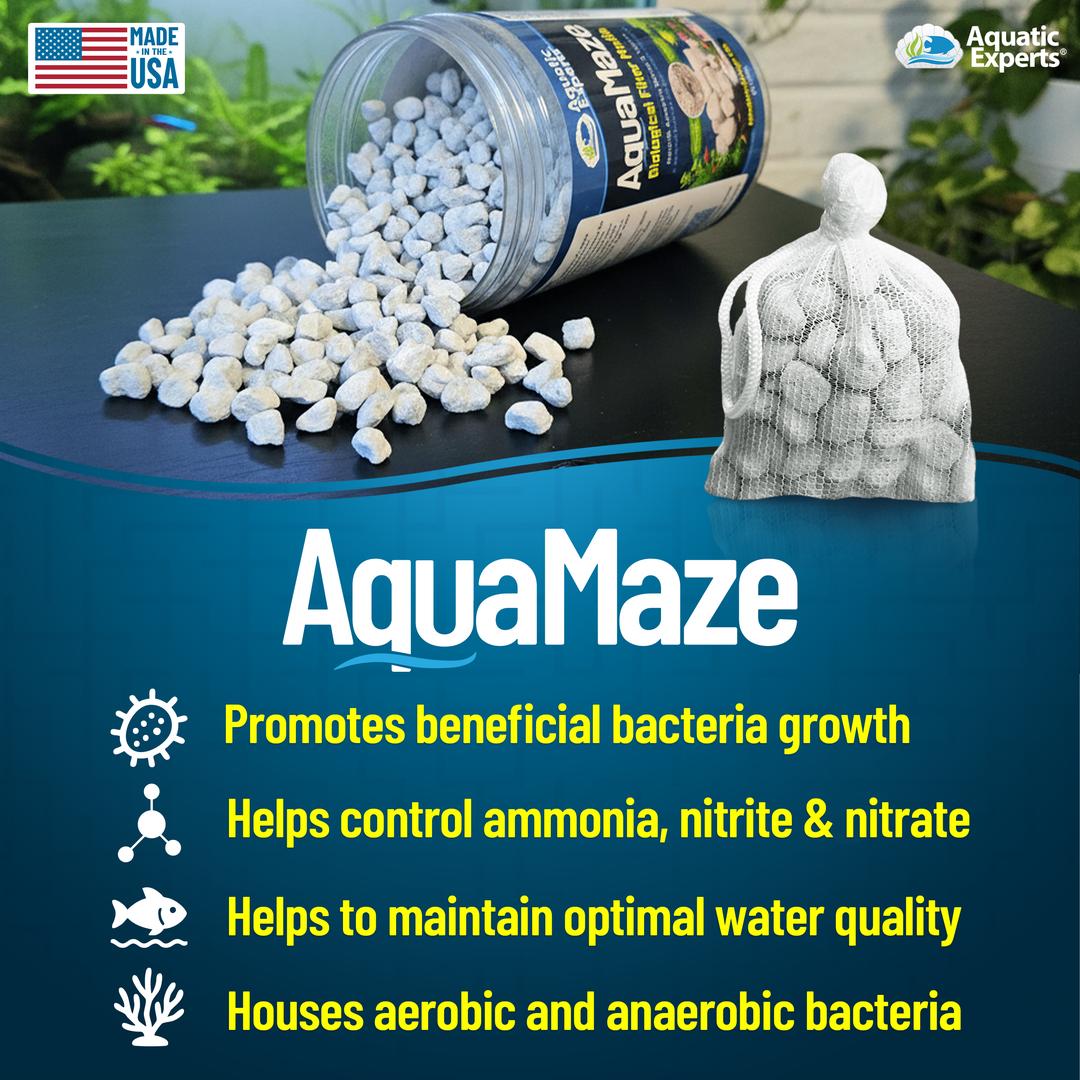 Directions: For every 10 gallons of water, use at least 50mL of AquaMaze. Increase the amount for heavily stocked aquariums. Rinse AquaMaze with clean or aquarium water to remove dust, then place it loose in filter trays or inside an Aquatic Experts MaxFlow or High-Flow Filter MediaBag. Position AquaMaze so that water flows through it after passing through mechanical filtration, such as pads or sponge media.